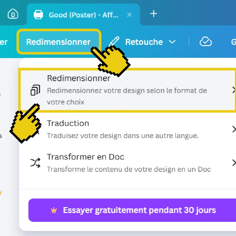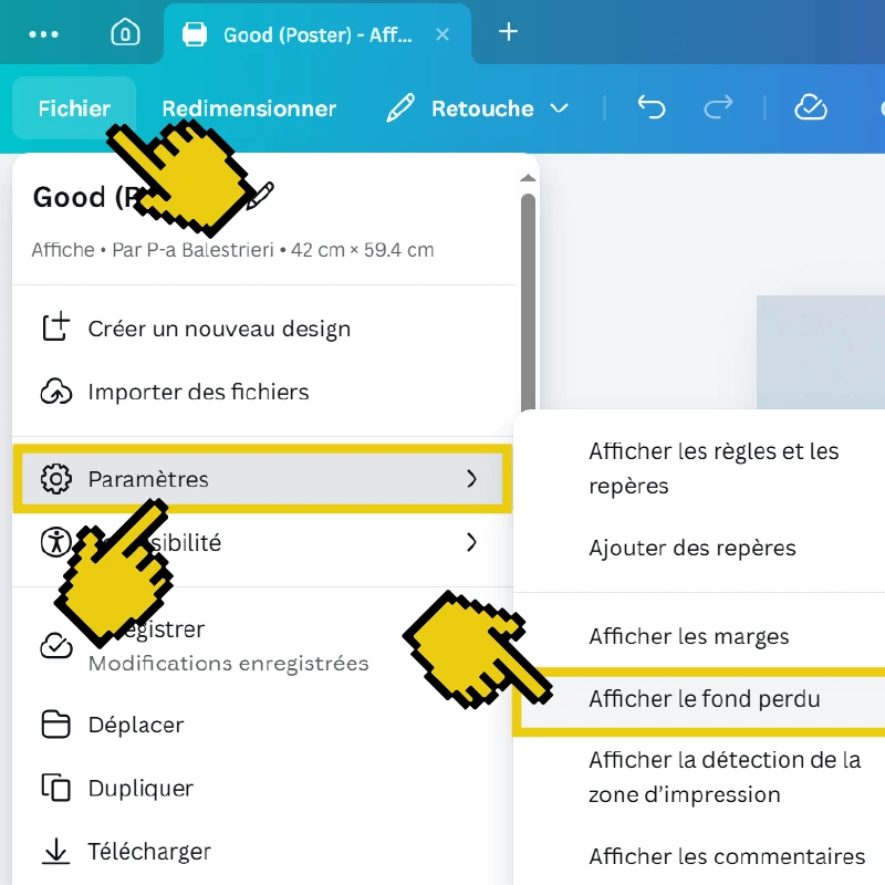 Attention, cette fonctionnalité n'est ouverte qu'aux Utilisateur·ices Payant de Canva ! C'est un des "pièges" de l'application : vous travaillez longtemps sur un document avant de vous rendre compte sur le tard qu'il n'est pas aux bonnes dimensions pour l'imprimeur.