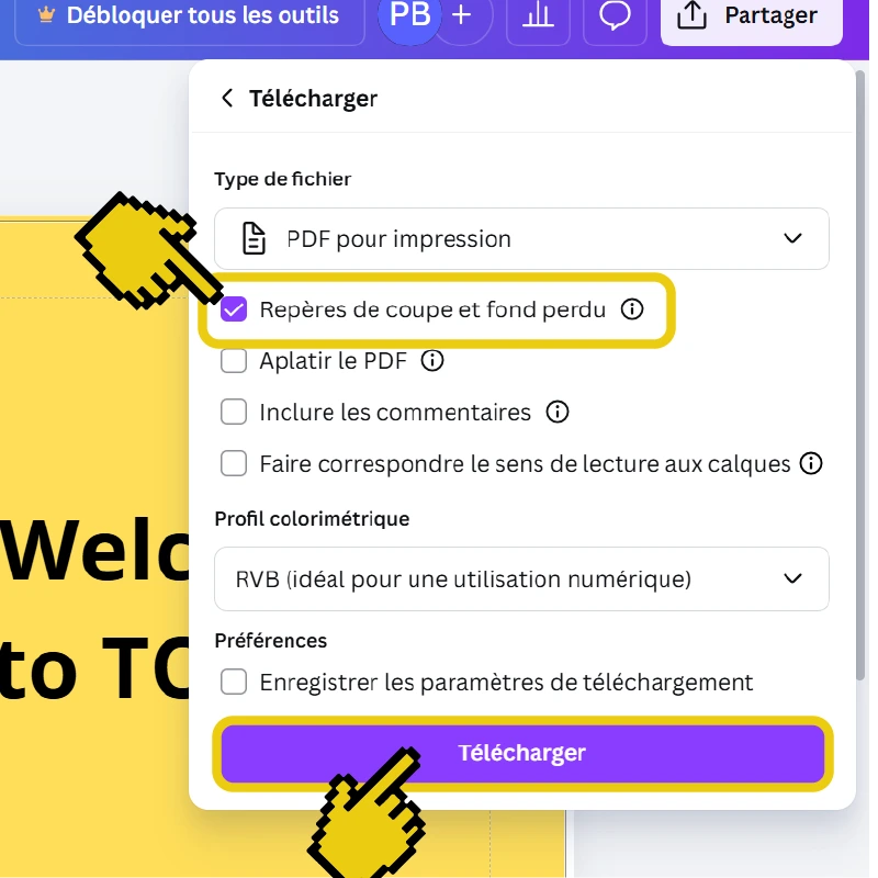 - Dans les options d'export, cochez Repères de coupe et fond perdu.